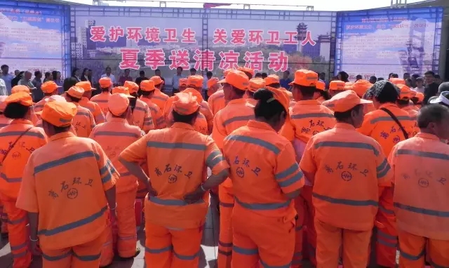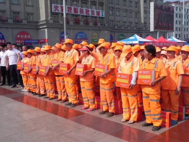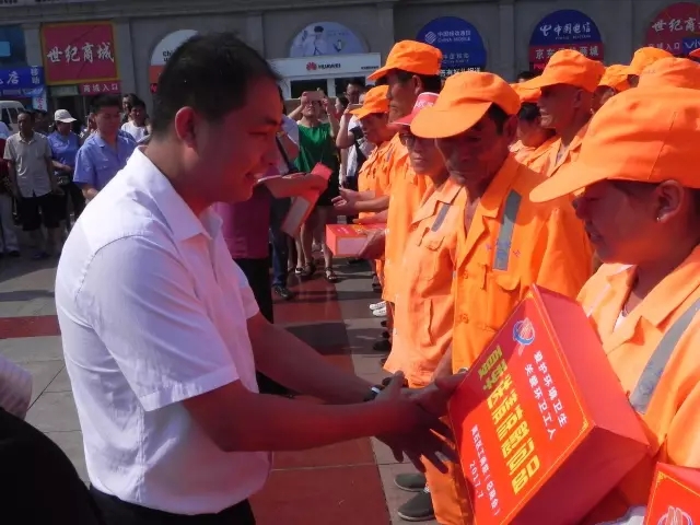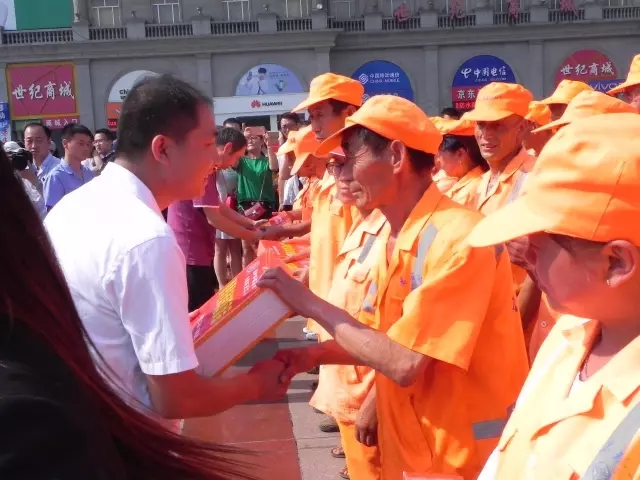 圖為:山西同仁康副總經(jīng)理向環(huán)衛(wèi)工人送上慰問品