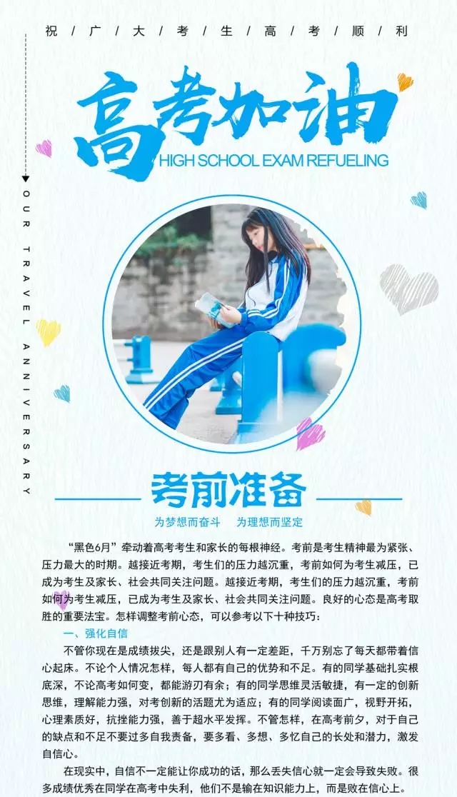 行:趕考過程中,要盡量選擇空調車,途中要備好防暑藥品和降溫飲料,要預計好時間,提前20到30分鐘到考場為宜。